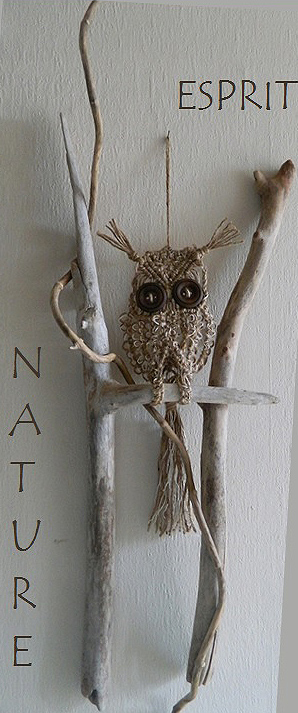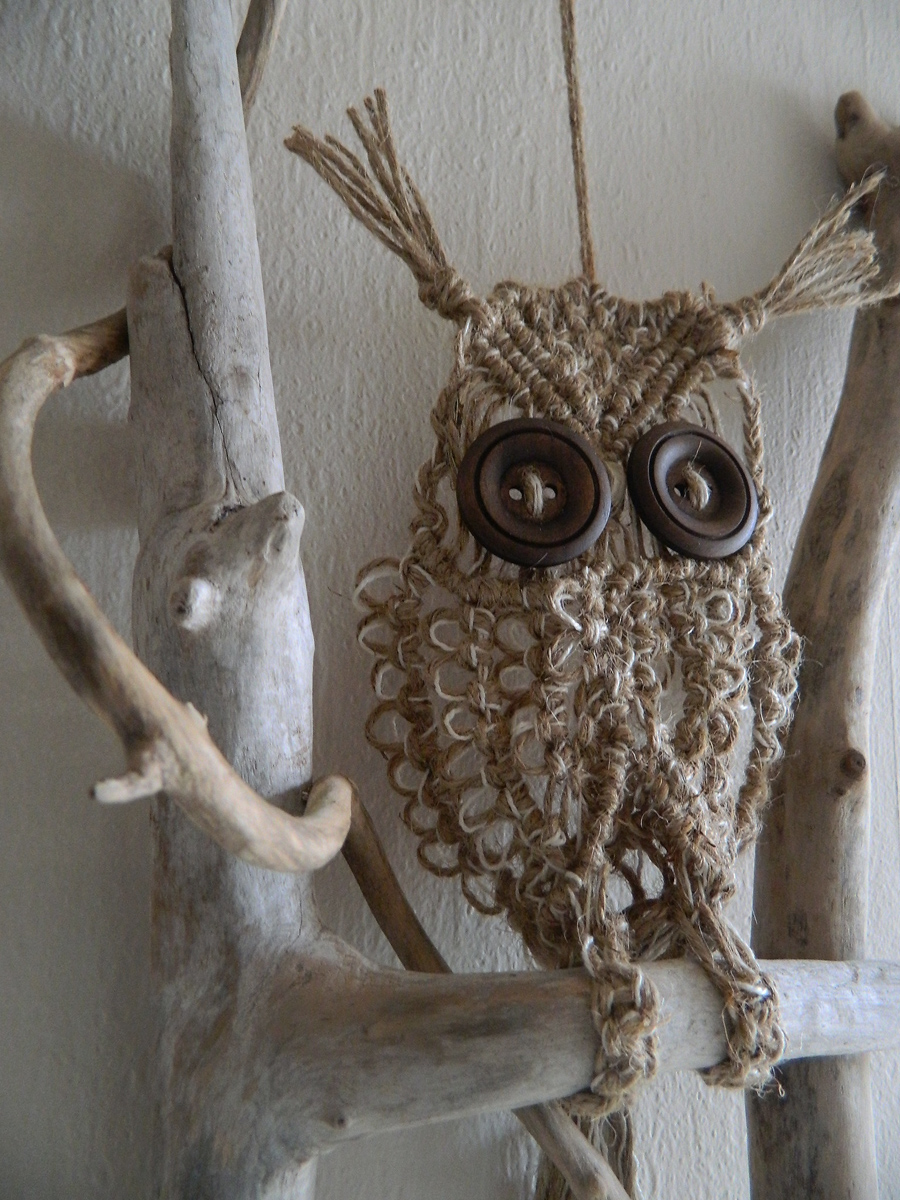 le perchoir d’une jolie chouette, conçue en ficelle naturelle, doublée d’un fil blanc pour plus de relief visuel.