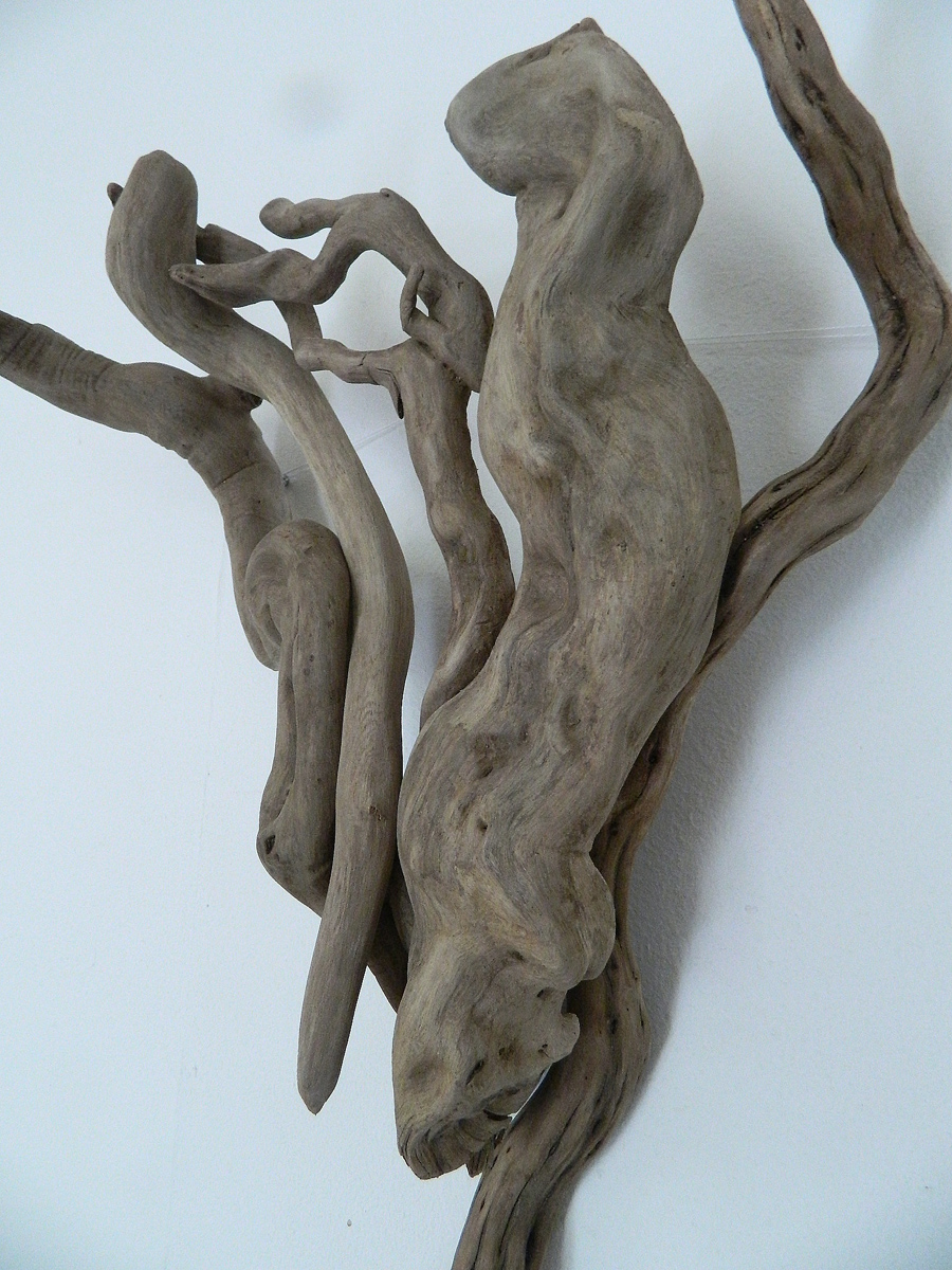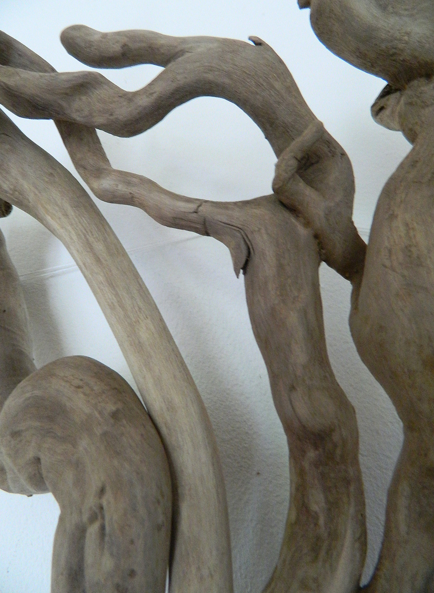 Des bois flotté légers dans les tons bruns foncé , la couleur est naturelle. Ils sont entrelacés astucieusement c’est ce qui fait son charme .Légèrement incurvée juste pour accueillir une ampoule qui ne chauffe pas.