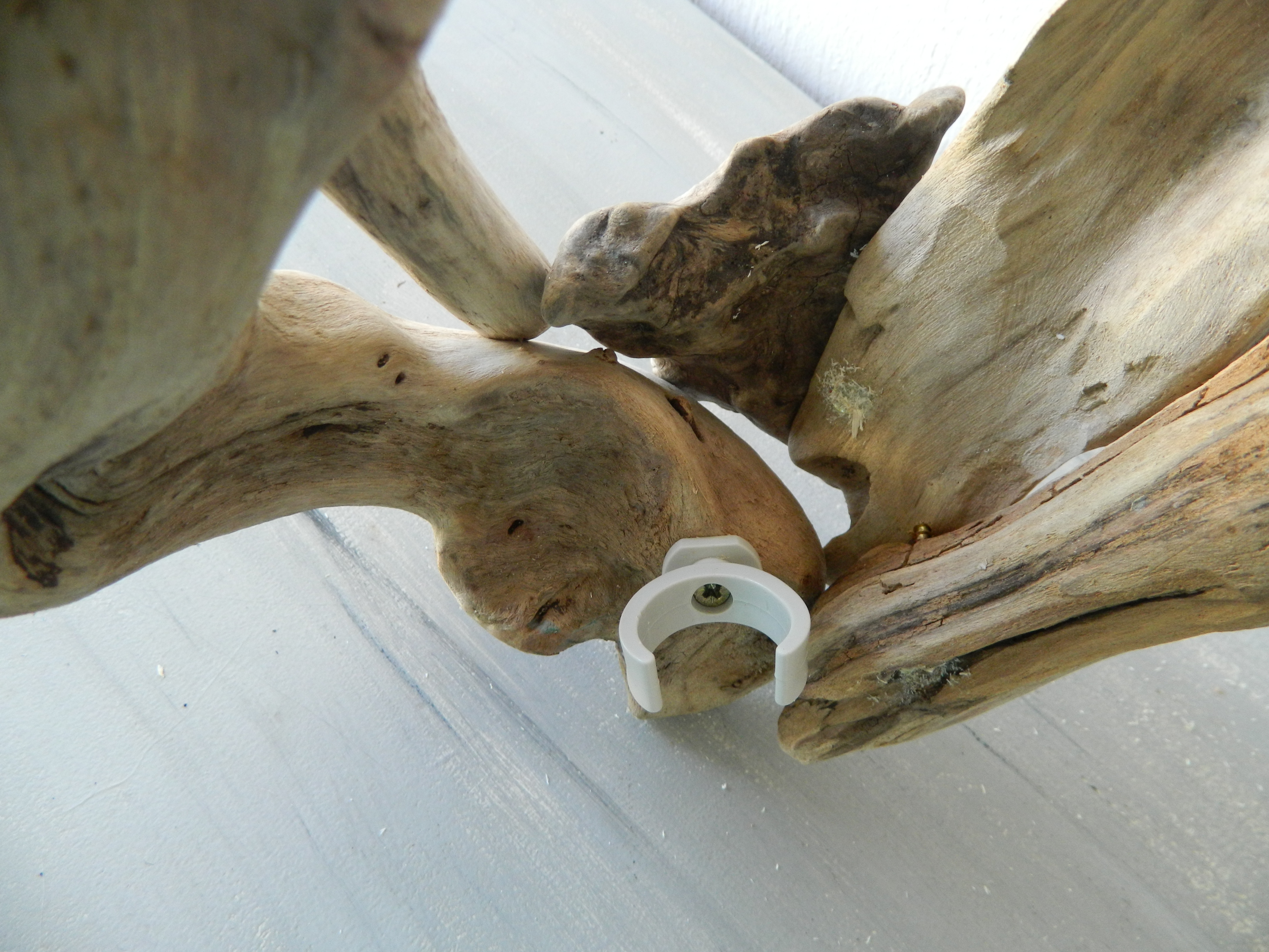 Une applique vraiment très originale, réalisée avec des bois flotté astucieusement fixés entre eux. L’ampoule ne se verra pas grâce au clip vissé à l’intérieur sur la partie inférieure. Je préconise une ampoule LED qui ne chauffe pas.