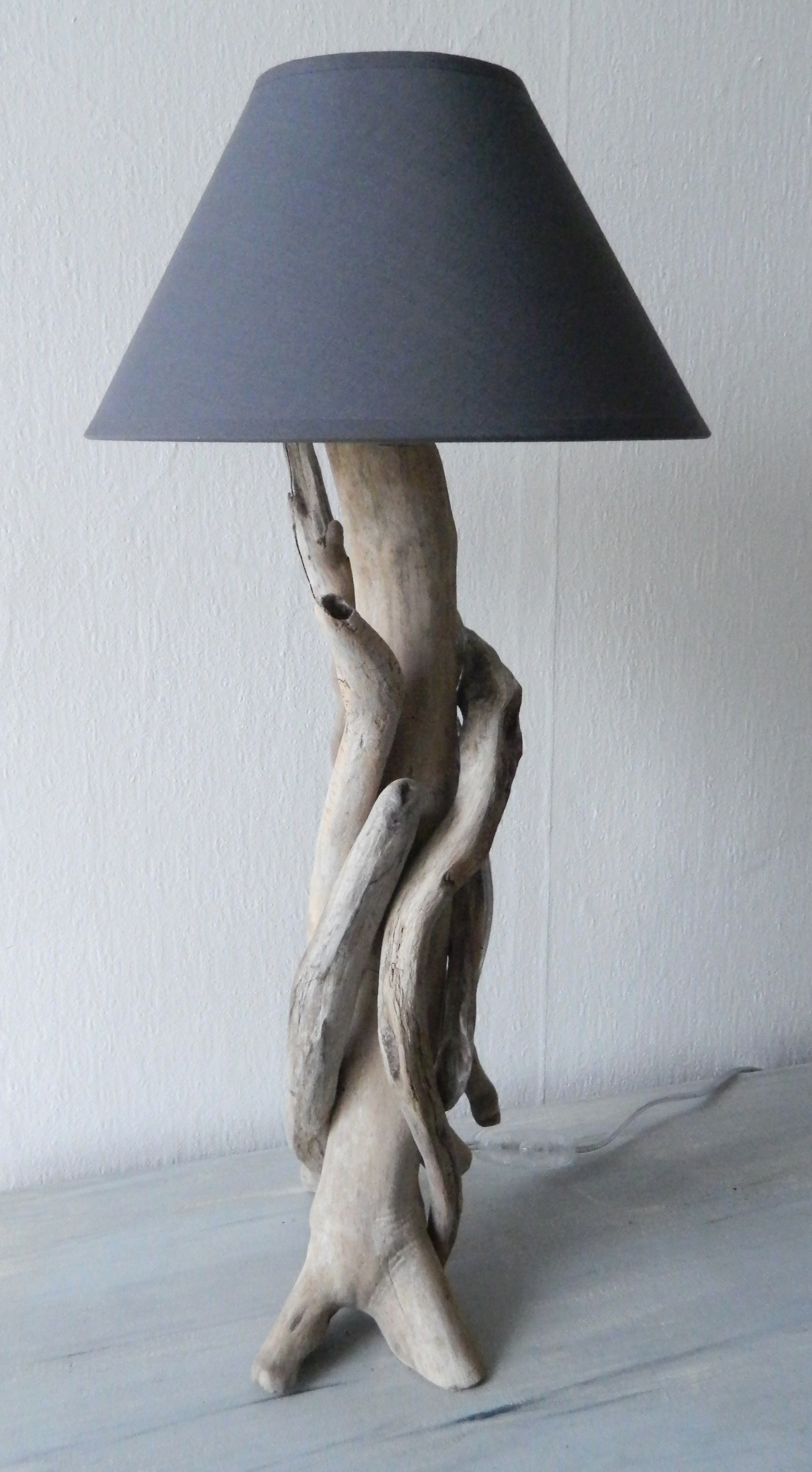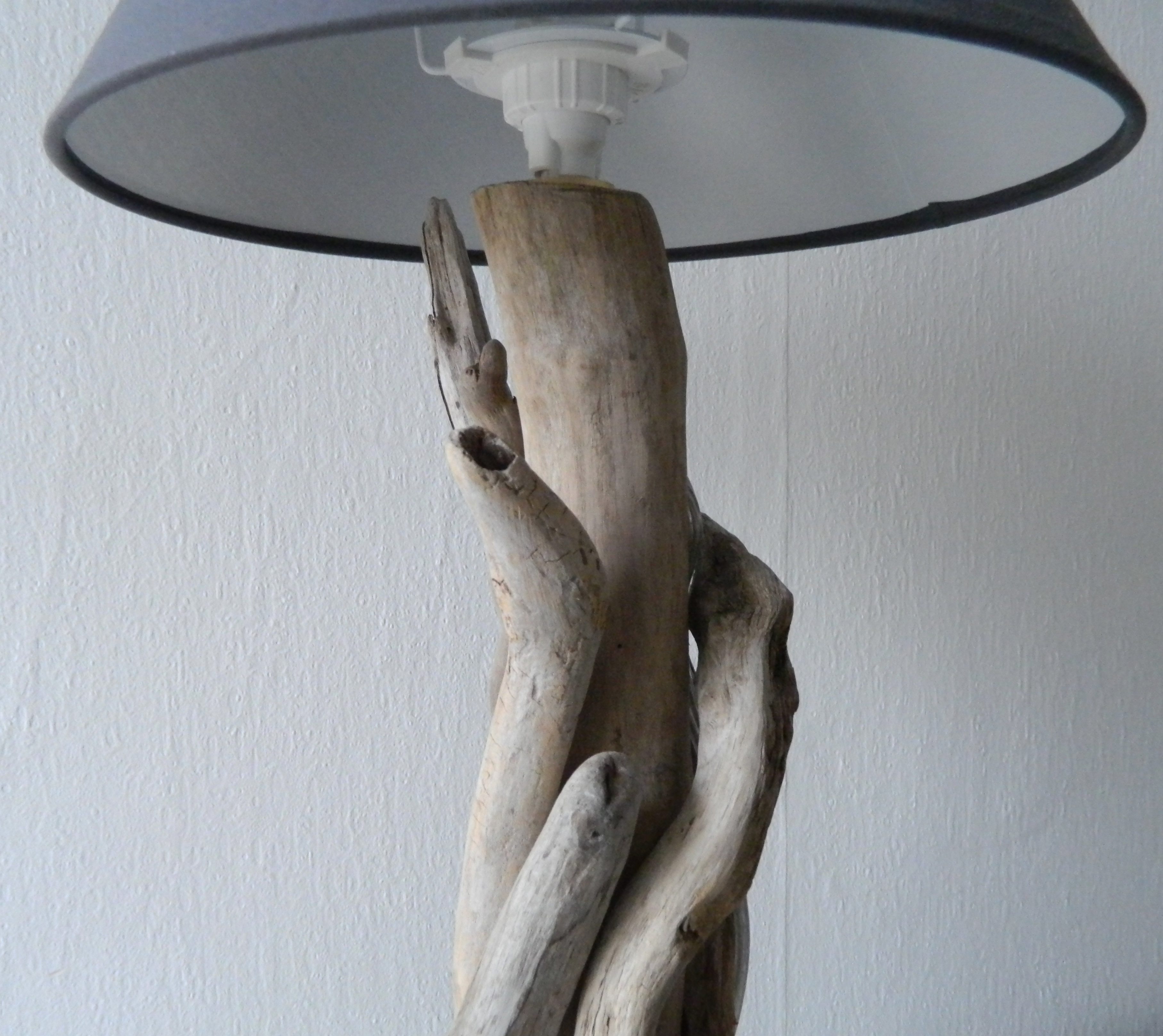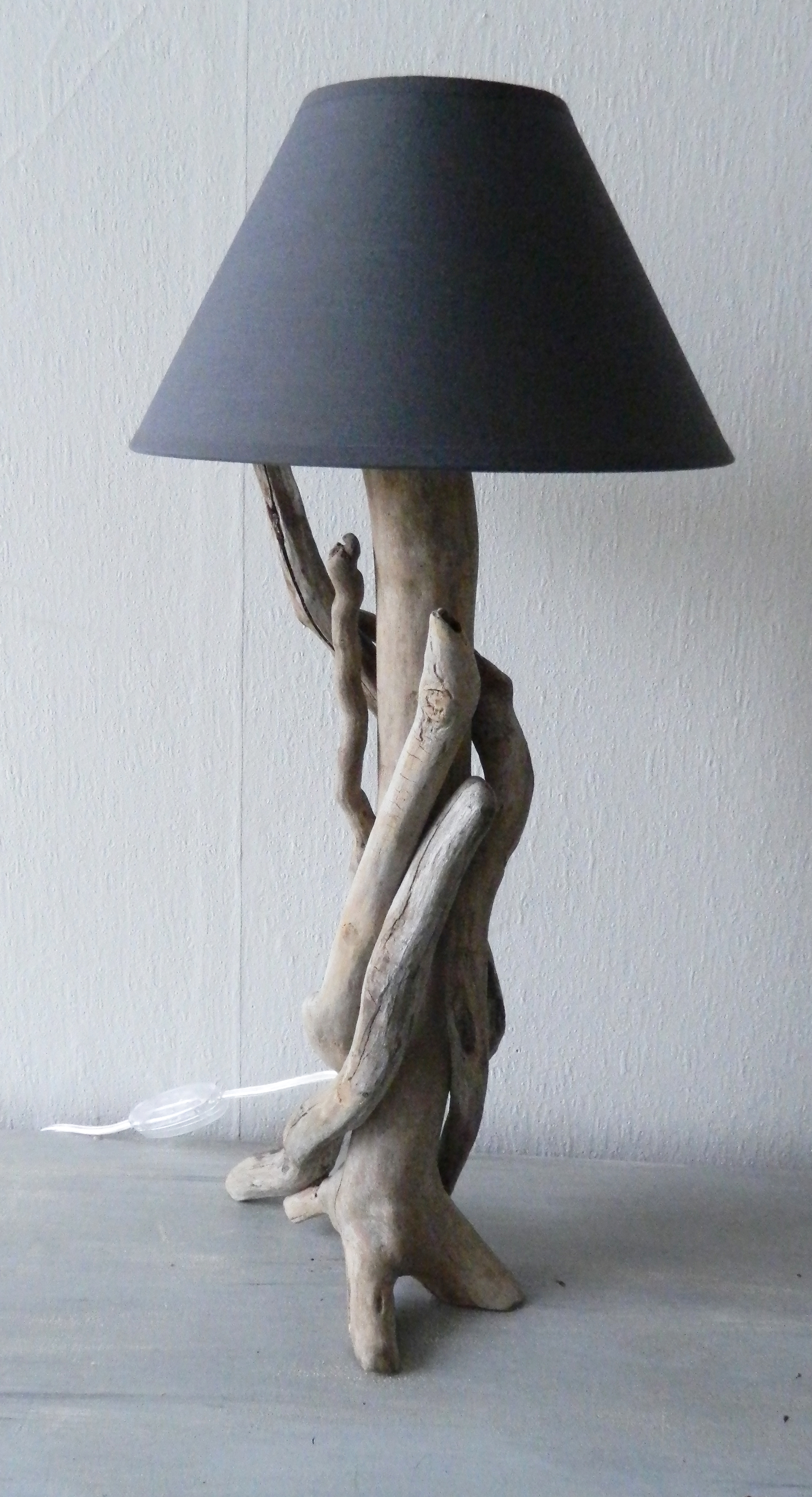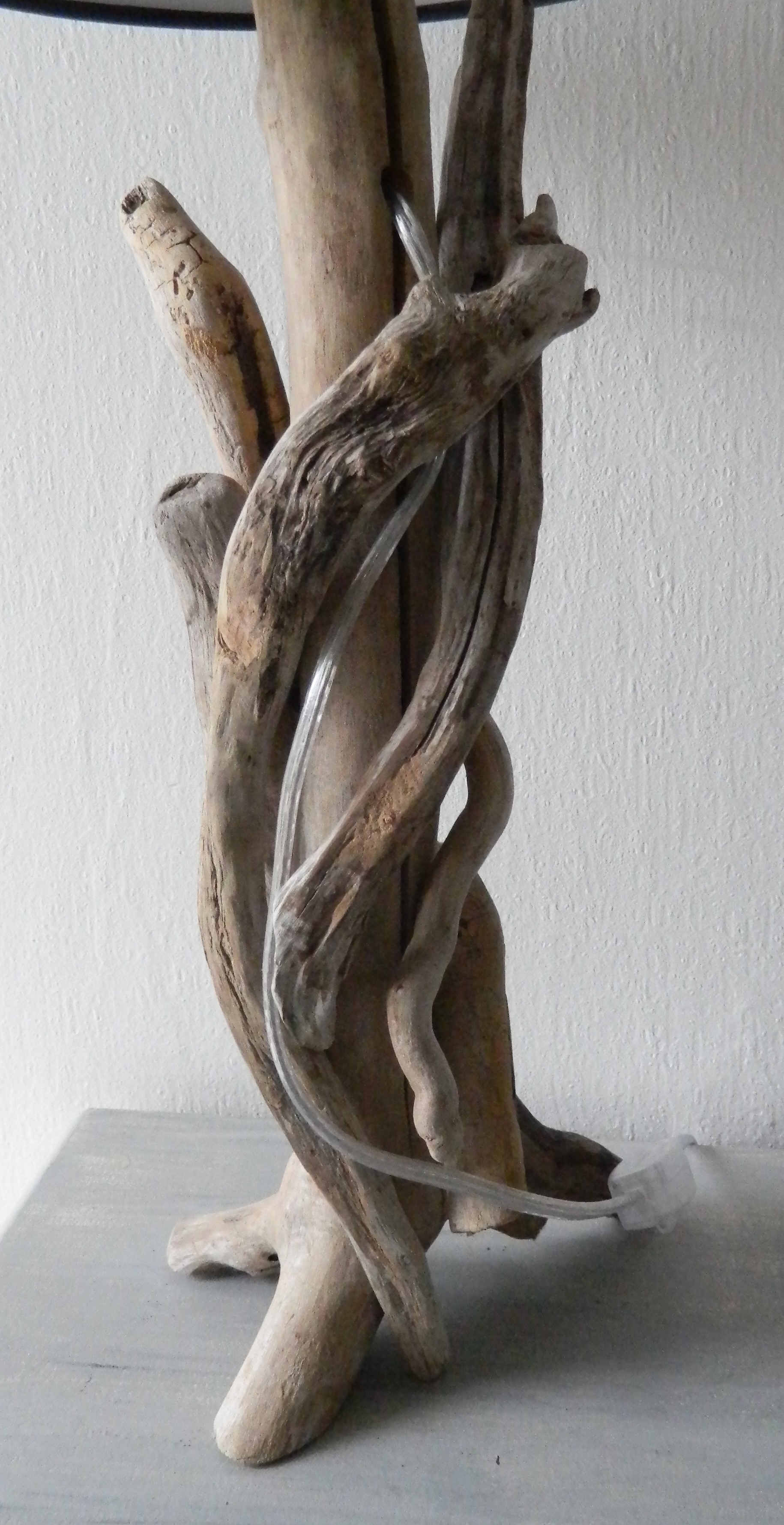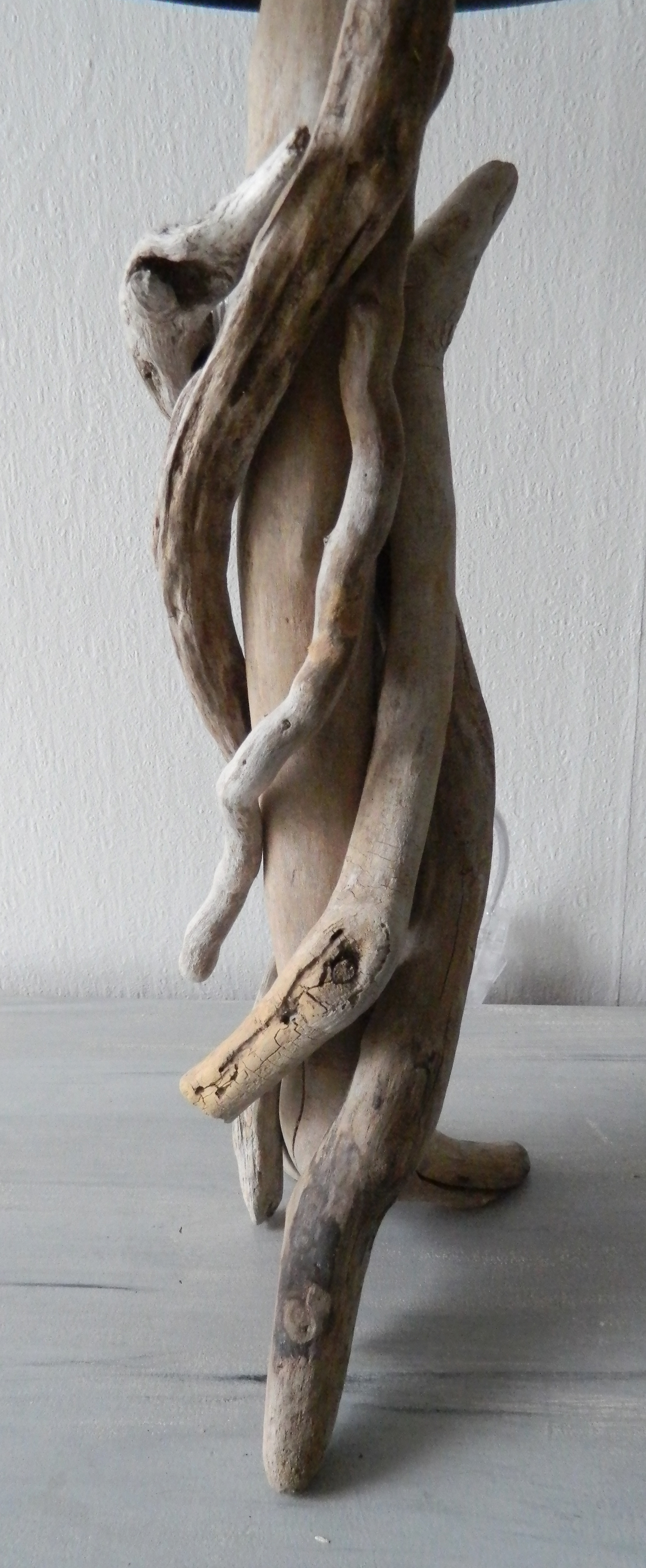 Une lampe à poser unique tout en mouvement, avec ses bois flottés enlacés.