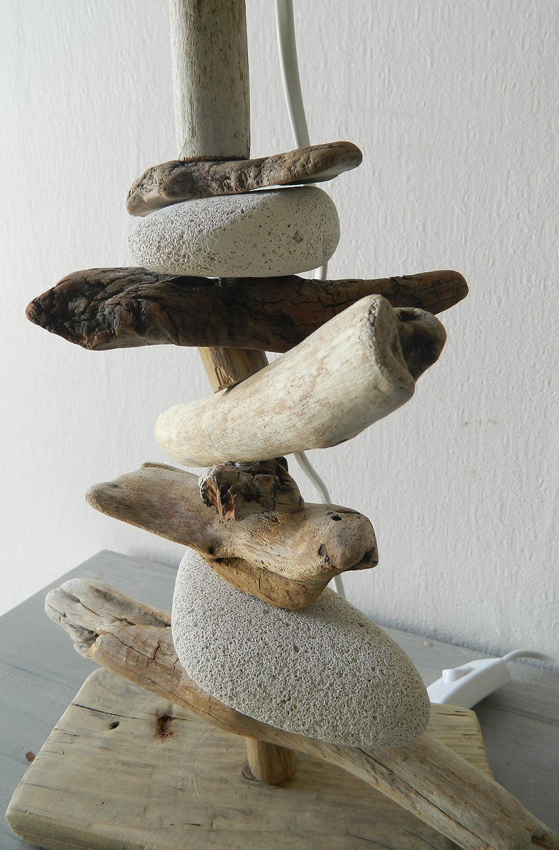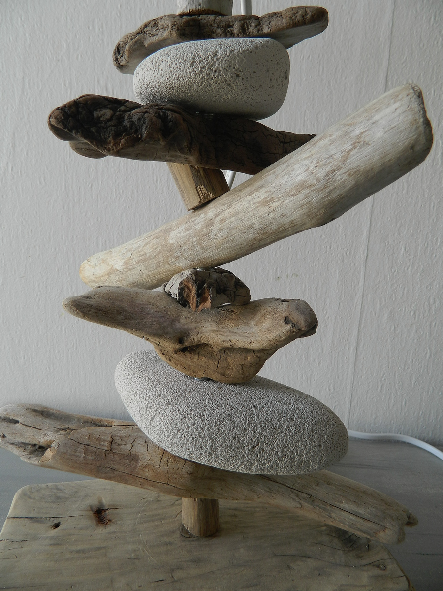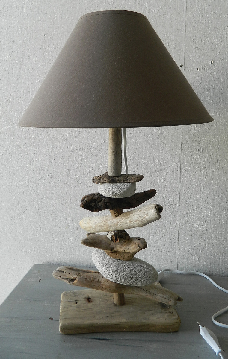 de cette lampe en bois flotté et galets .Magnifique !!!