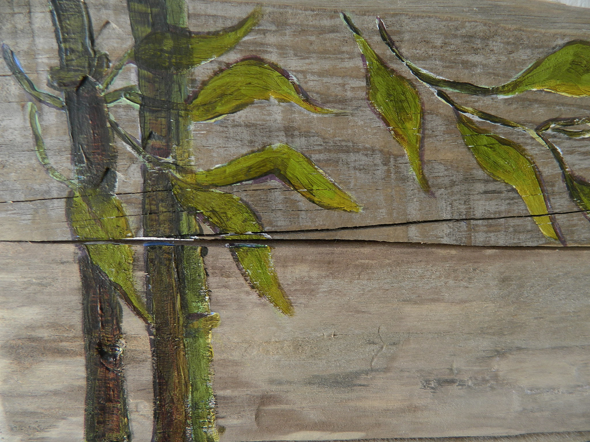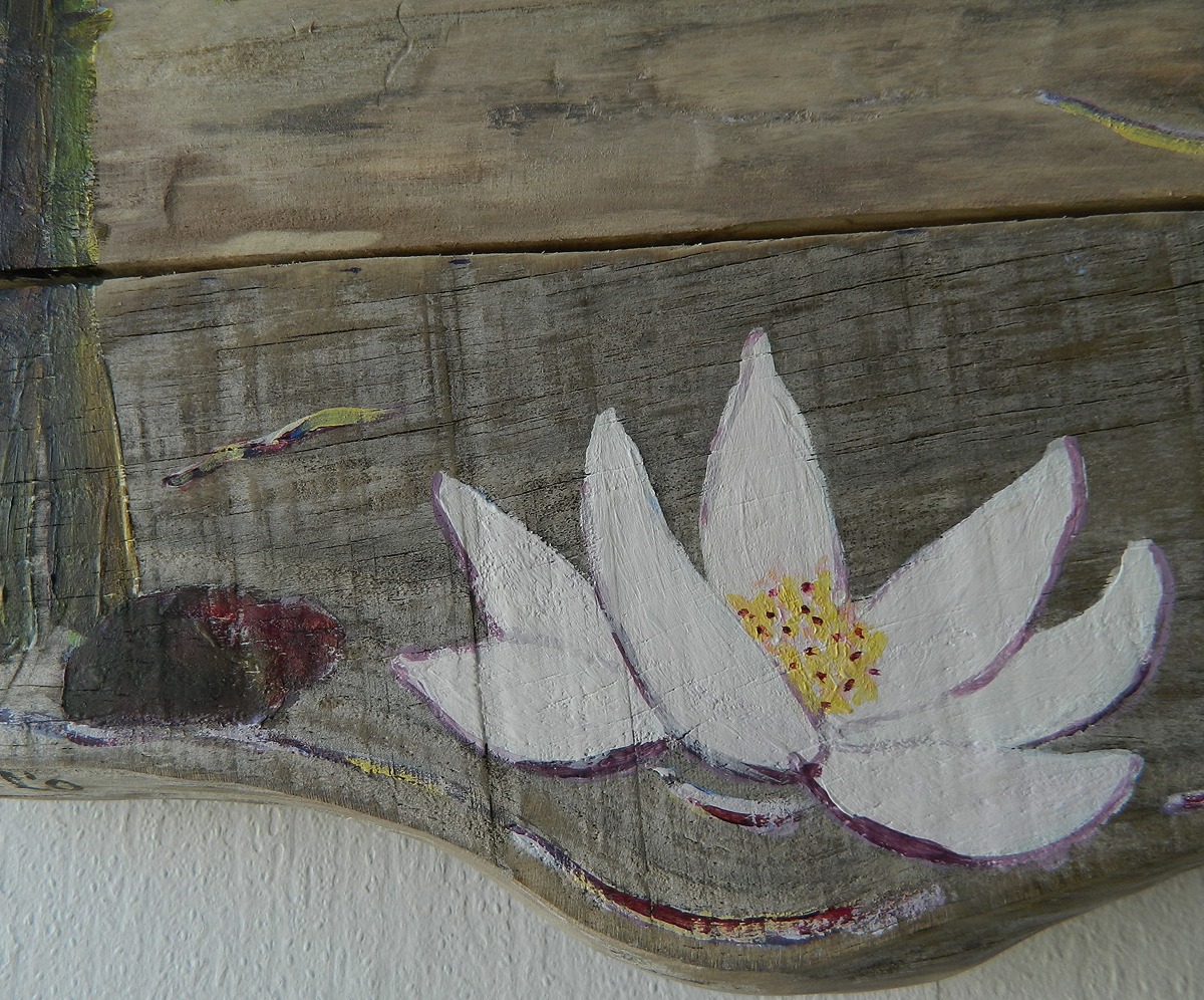 Des planches grisées par le temps, et une peinture réalisée par Anne marie Hage (artiste peintre) .