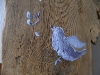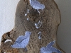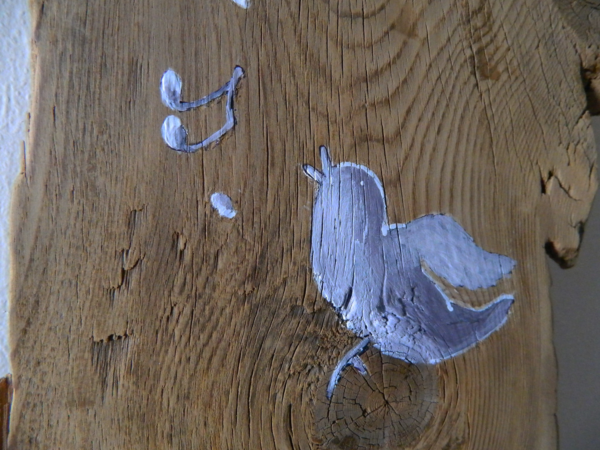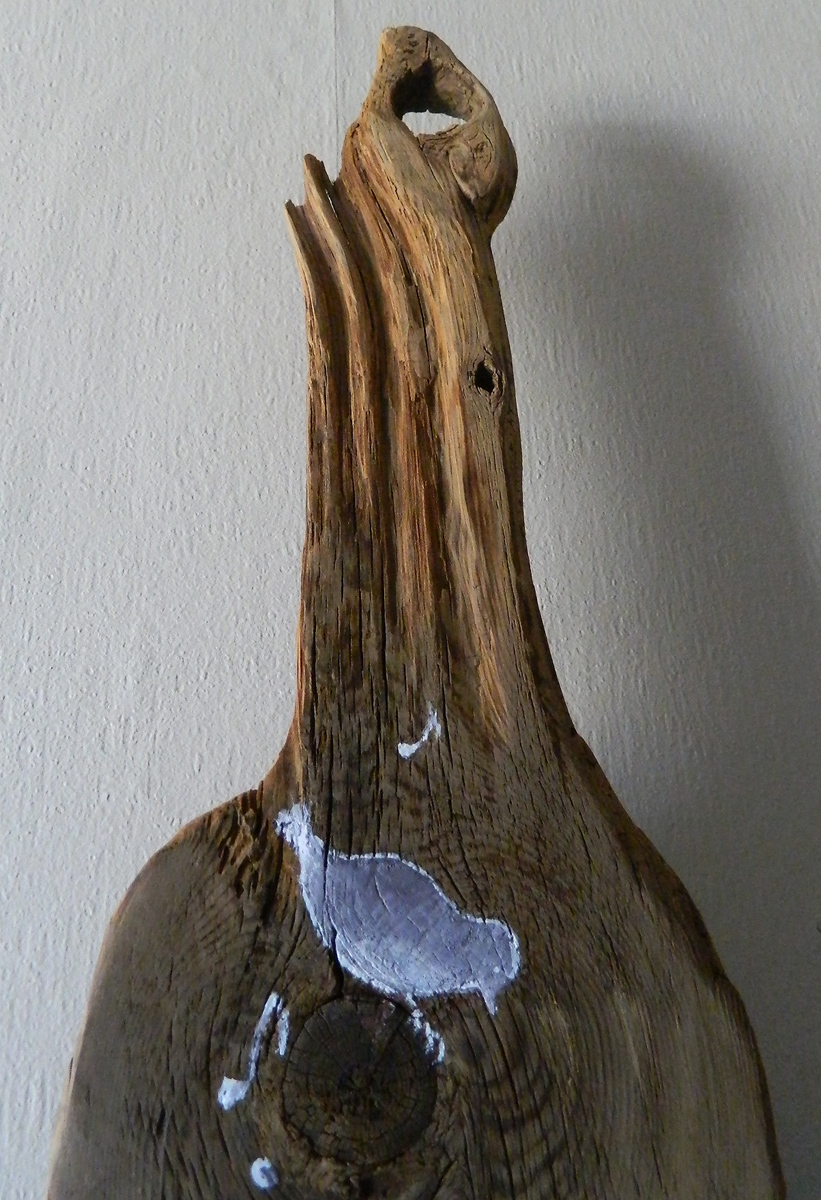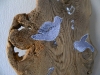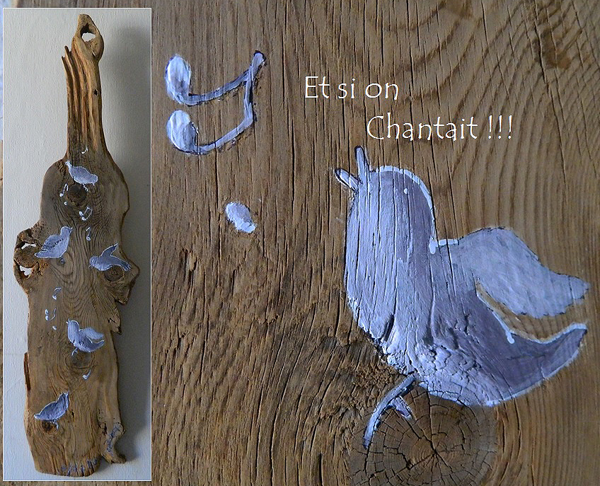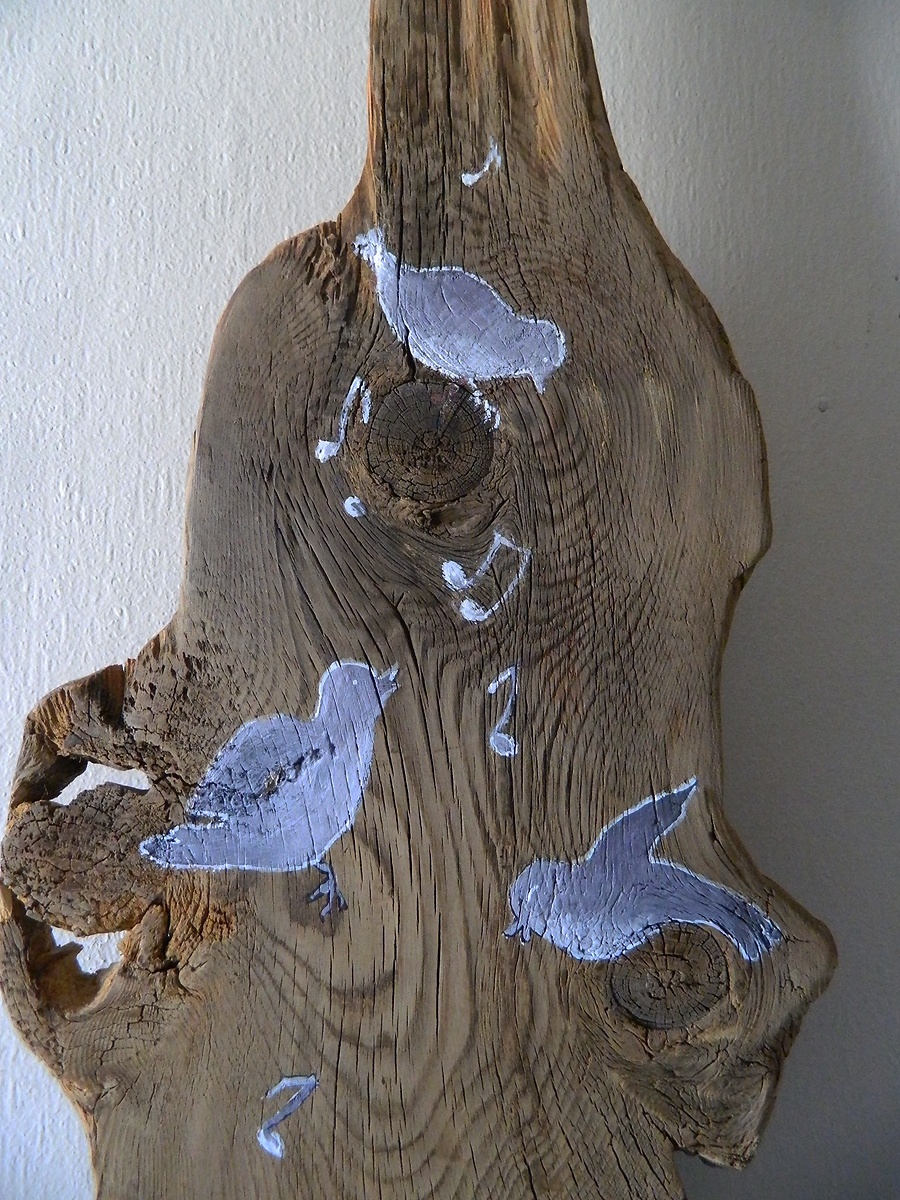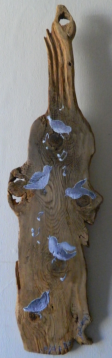 Les noeux du bois sont astucieusement utilisés de perchoir pour les 5 adorables oiseaux peint par Anne-marie Hage.