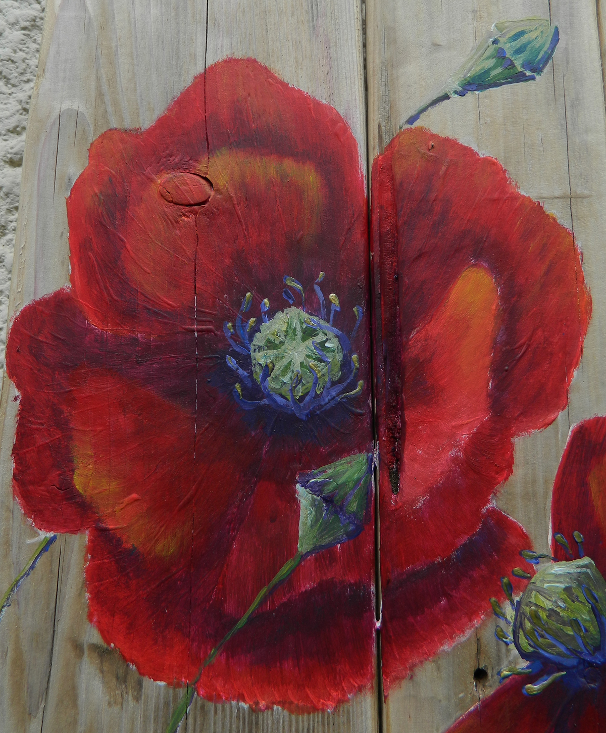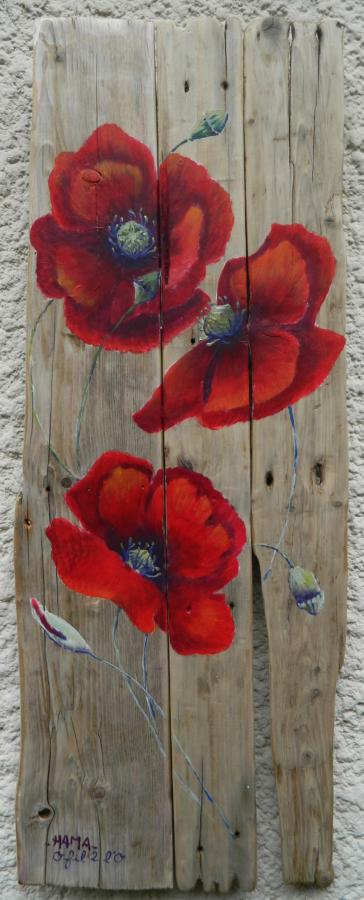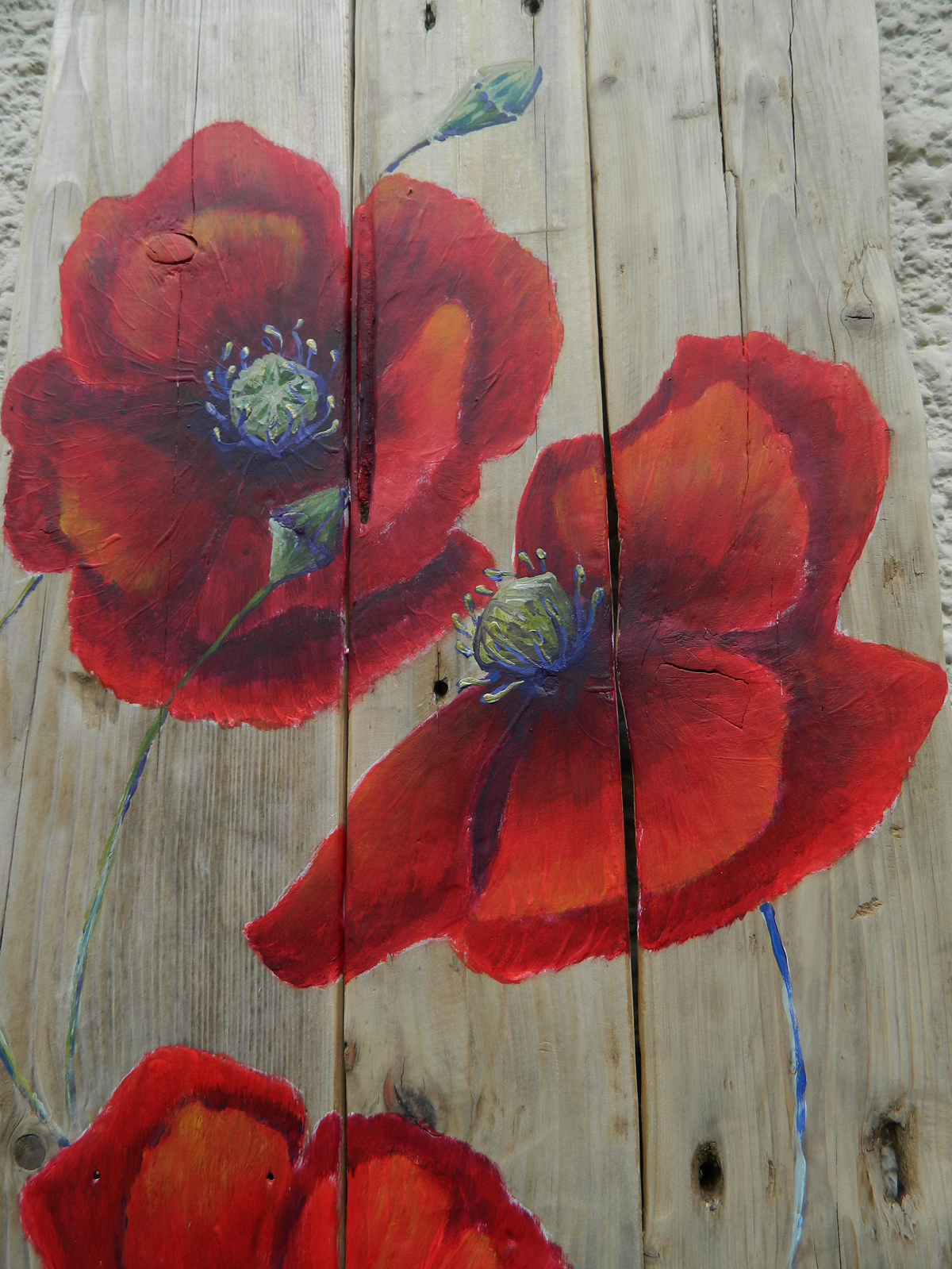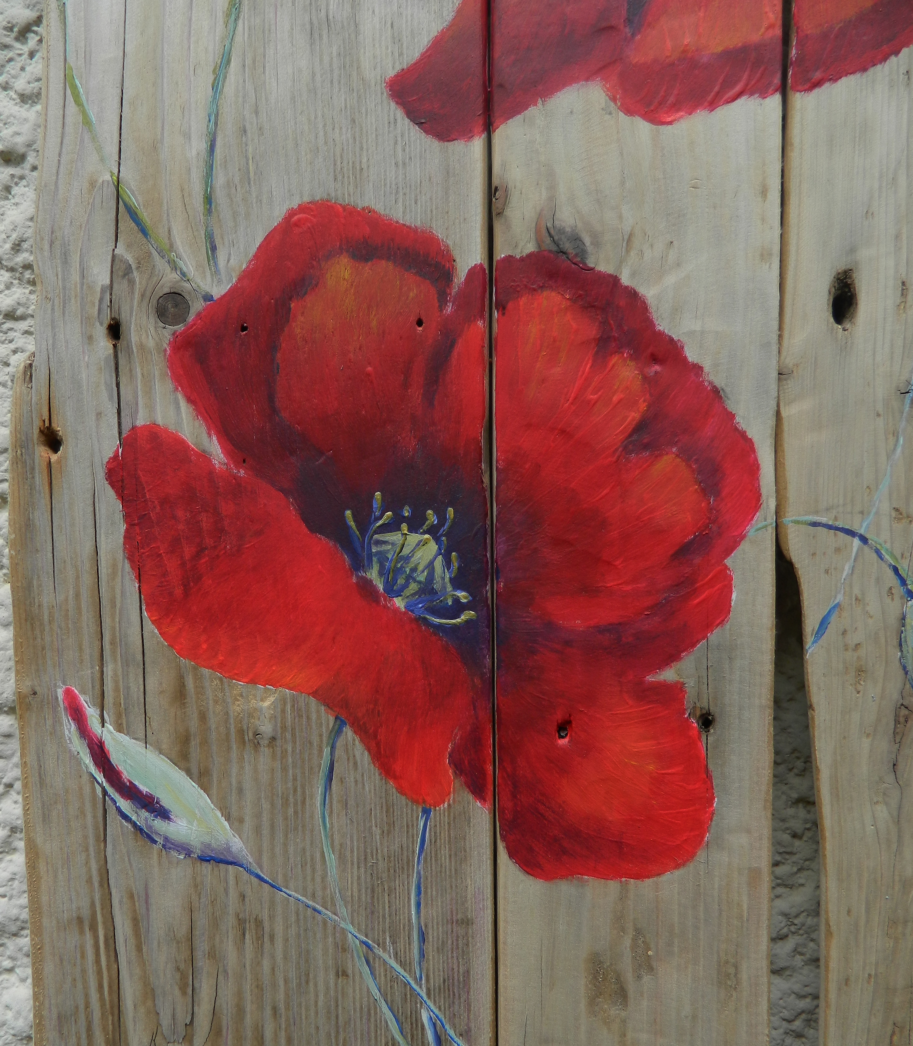Voici une création unique… un support en bois flotté avec ses planches qui nous rappelle comme la nature est sauvage et comme pour mieux s’identifier à elle des coquelicots synonymes d’une nature indomptable peints par Anne-Marie Hage, artiste peintre.