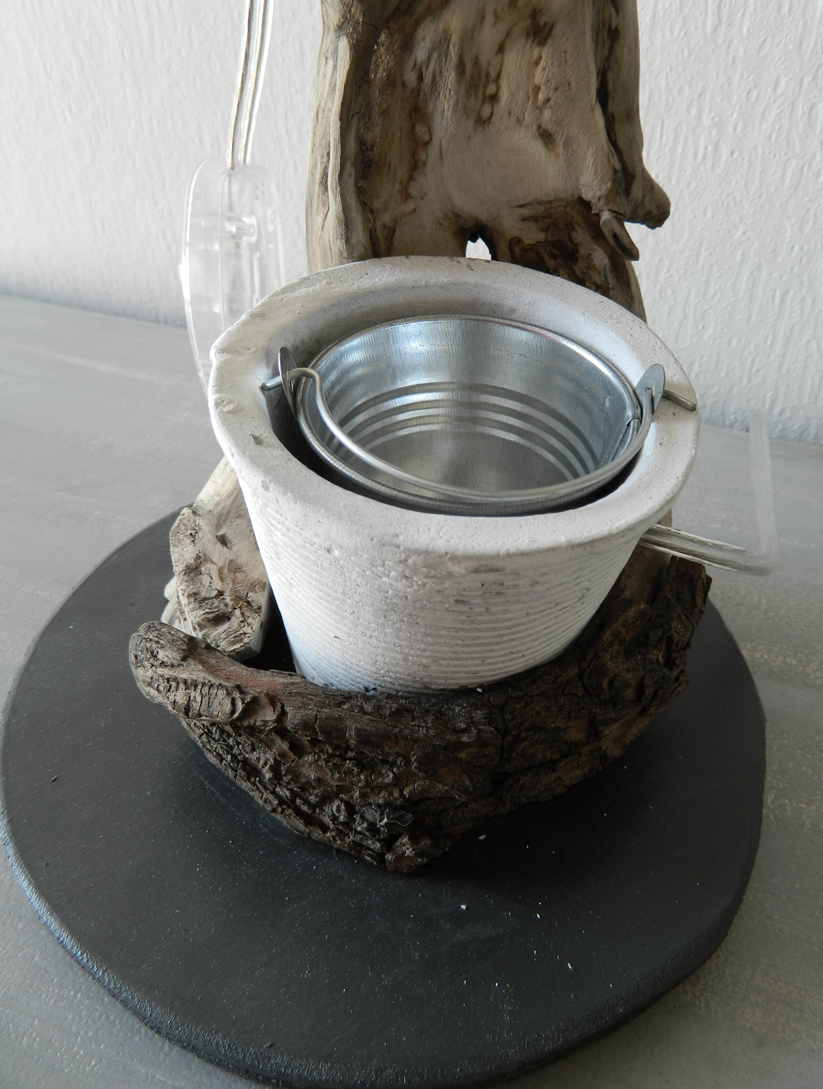 Conçue pour insérer un pot qui accueillera une plante prête à grimper sur cette racine autrefois de lierre et devenue bois flotté.
