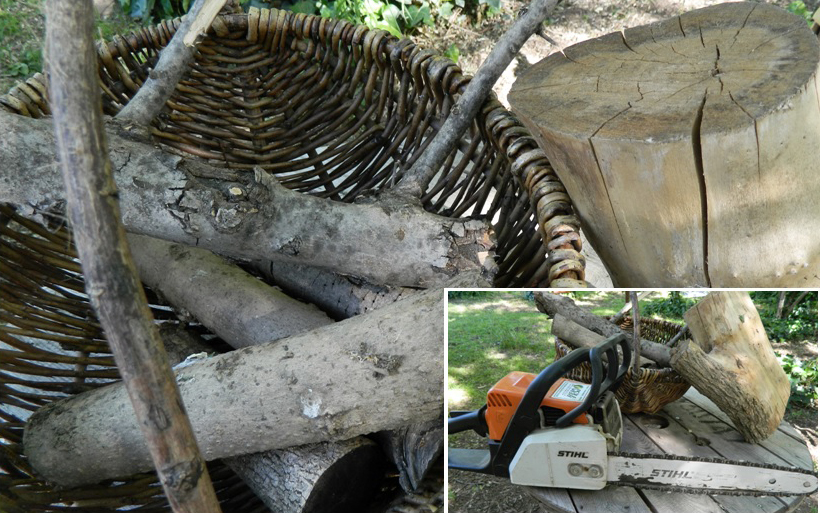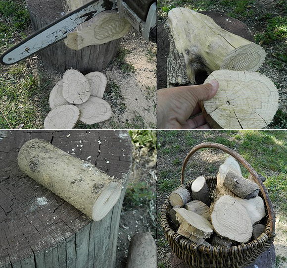 – Sélectionner des branches d’arbres de  5 cm de diamètre environ dans la forêt ou dans votre stock de bois d’hiver ainsi qu’un morceau plus large qui servira à faire le support.