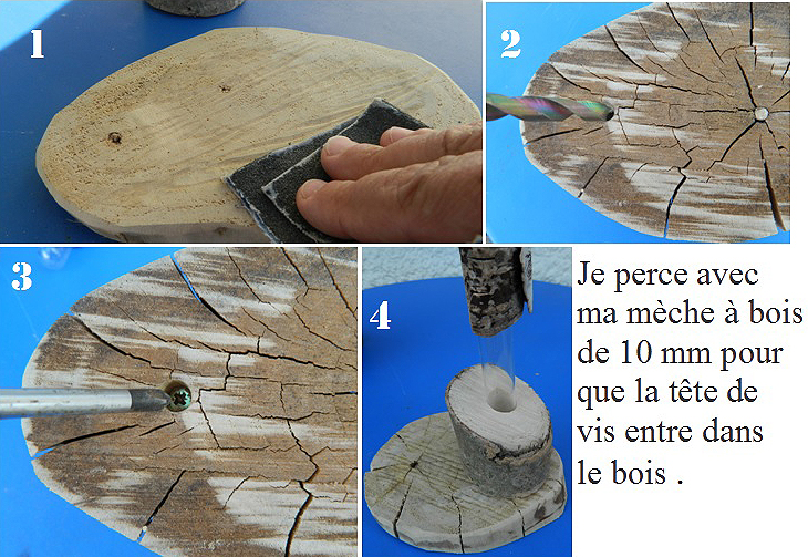 – A l’aide de ma mèche plate je perce sur 5 cm de profondeur environ au centre de mon morceau de bois.