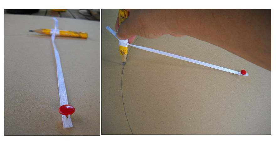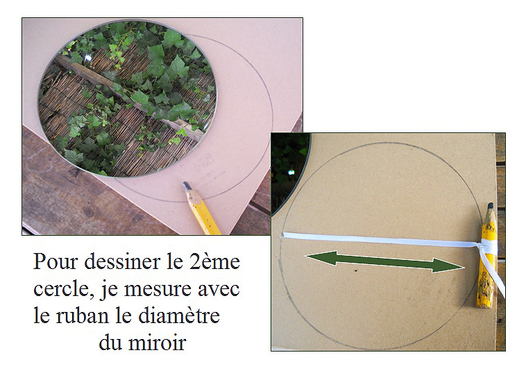 – Pour le  contour  du support( qui mesure le double du miroir), prendre comme repère avec le ruban le diamètre du miroir rond et nouer l’extrémité du ruban autour du crayon (voir photo).