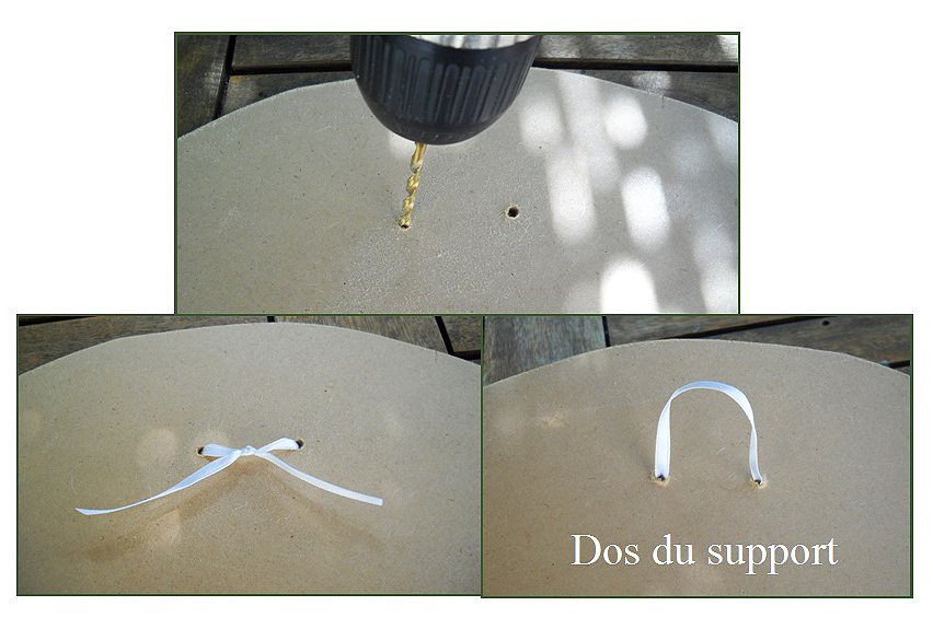 – Prendre le cercle du support (le plus grand) et percer 2 trous en haut et au milieu pour insérer le ruban qui va servir à  suspendre le miroir fini.