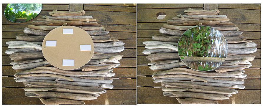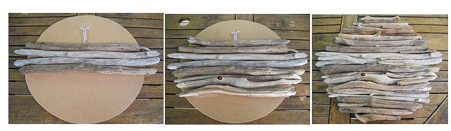 – Puis fixer avec la colle à bois les bois flotté sur votre support. Je conseille de combler les  espaces avec des petits bois flotté pour cacher le médium