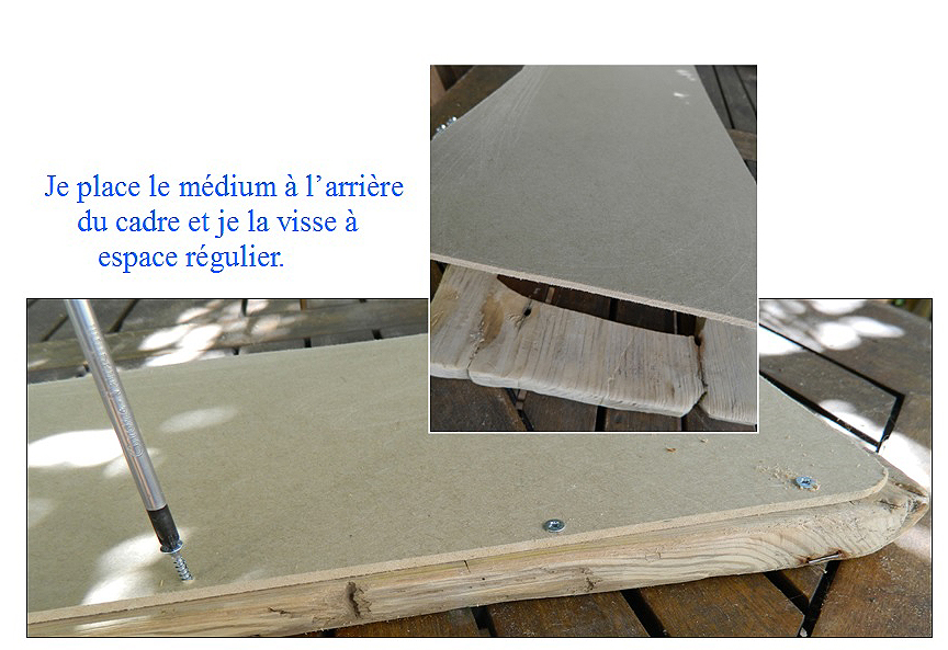 – Retourner votre cadre et poser le médium dessus pour le visser par l’arrière à intervalle régulier.