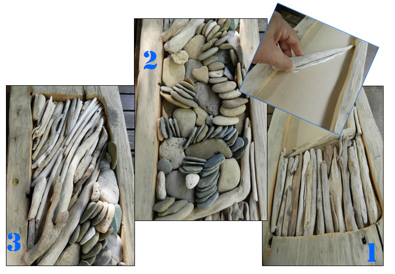 -J’utilise de la colle à bois pour les bois flotté et de la colle néoprène à fixation rapide pour les galets.