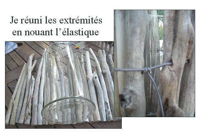 – Une fois tous les bois réunis par les deux rangs d’élastiques, poser le vase par dessus et nouer les extrémités solidement par un double noeud.
