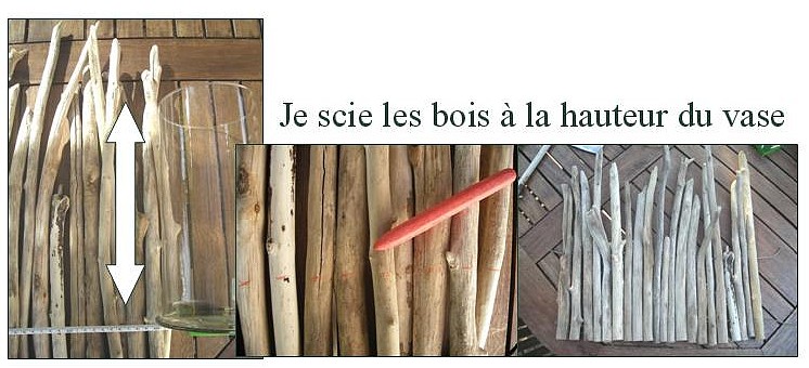 Mesurer la hauteur voulue en disposant votre vase juste à côté. Laisser dépasser un peu les bois de la surface du vase.