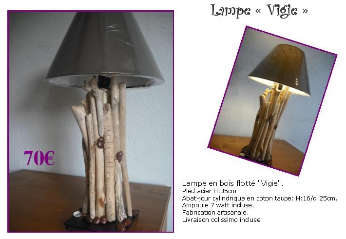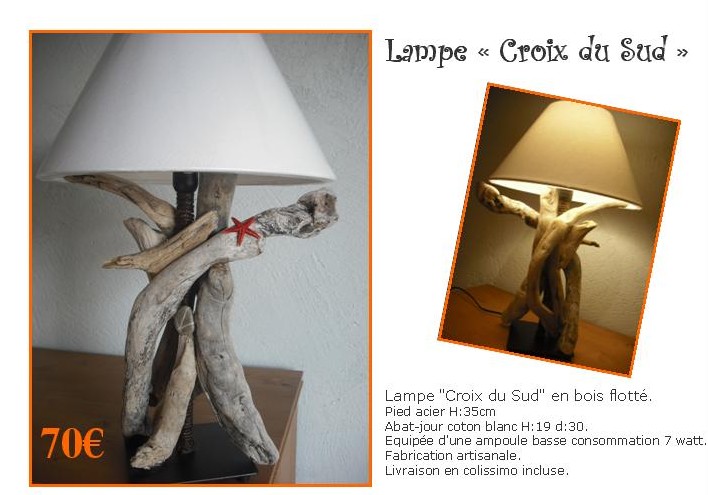 Le bois flotté, ayant subi tempêtes et marées, est rejeté sur la plage, puis, au cours de nos promenades, nous revenons, mes enfants et moi, les bras et les poches remplis de ces trésors et je les assemble, je les marie par forme et couleur pour en faire des objets de décoration : lampes, cadres photos, miroirs