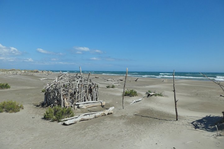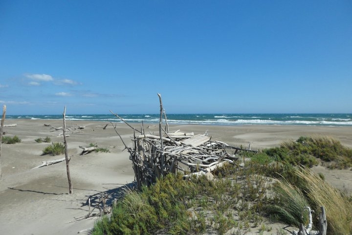 Tout s’enchaine rapidement, au printemps je décide de construire une cabane en bois flotté sur une plage ou se trouve une « grosse réserve de bois flotté ». Une plage très peu fréquenté, avec un accès difficile, une des dernières plages sauvage de France ou le bois s’accumule depuis des années. Un petit coin de paradis… Privilège des habitants de salin de Giraud. Tout était réuni pour créer la page face book « Cabane En Bois Flotté » pour partager ce lieux unique, magique, c’est bois féériques… C’est tout une plage que j’ai « aménagé » avec deux cabanes, des billots de bois que je redresse, des arbres entier que je plante dans le sable juste pour le plaisir d’admirer, de contempler de la cabane cet espace avec pour horizon la mer.