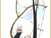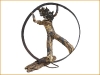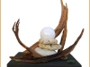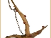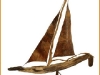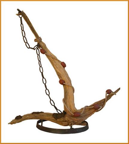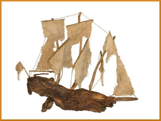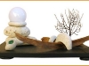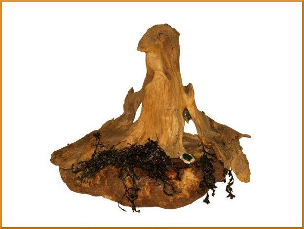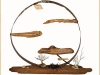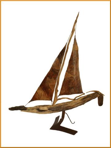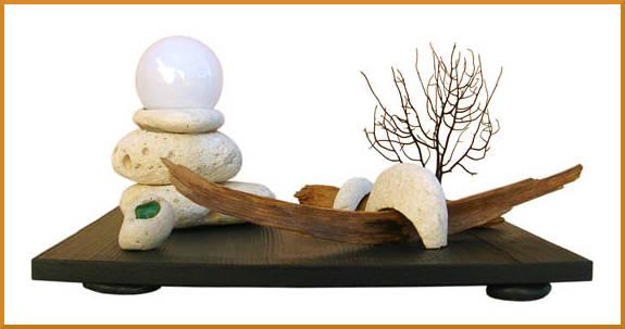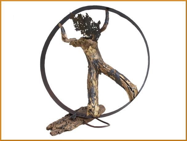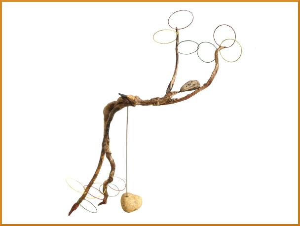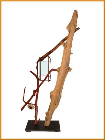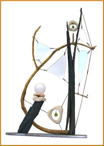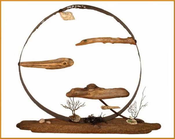 Comme il le dit si bien: » c’est dans mon petit atelier que je laisse ces témoins de vie me raconter leurs voyages , de pays lointains en rivages solitaires avant de les mettre en scène . Bois flottés , galets, verres dépolis, gorgones se mêlent aux végétaux , lanières de cuir, miroirs,souches et fers rouillés. »