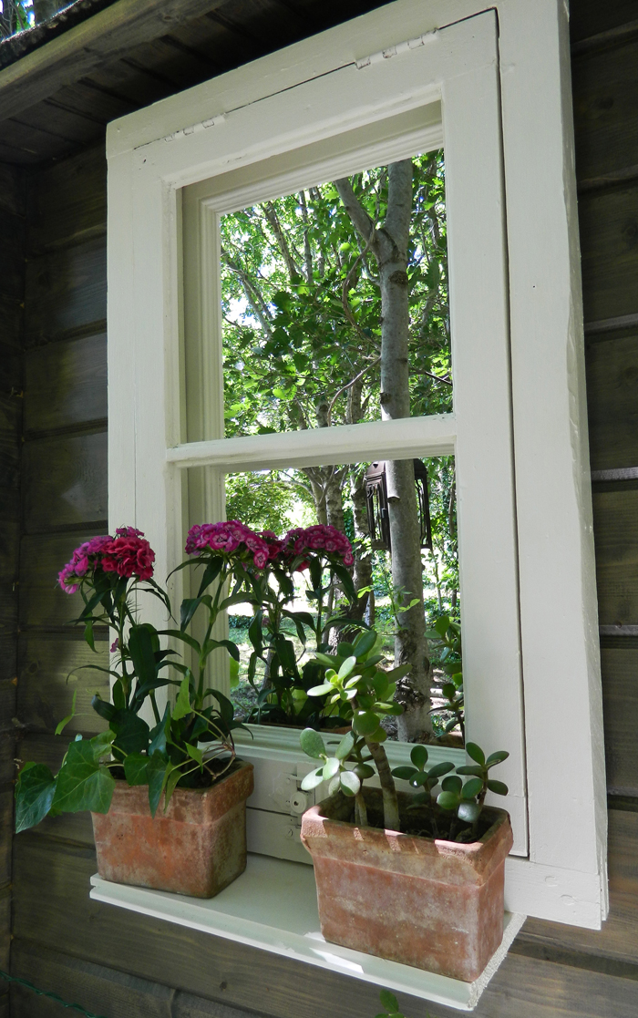 Pourquoi ne pas utiliser une vieille fenêtre pour la transformer en miroir de jardin. Les jardins aussi ont droit à leur miroir , très déco et en plus son effet de perspective et de reflet  il donnera l’impression d’avoir un jardin plus grand!