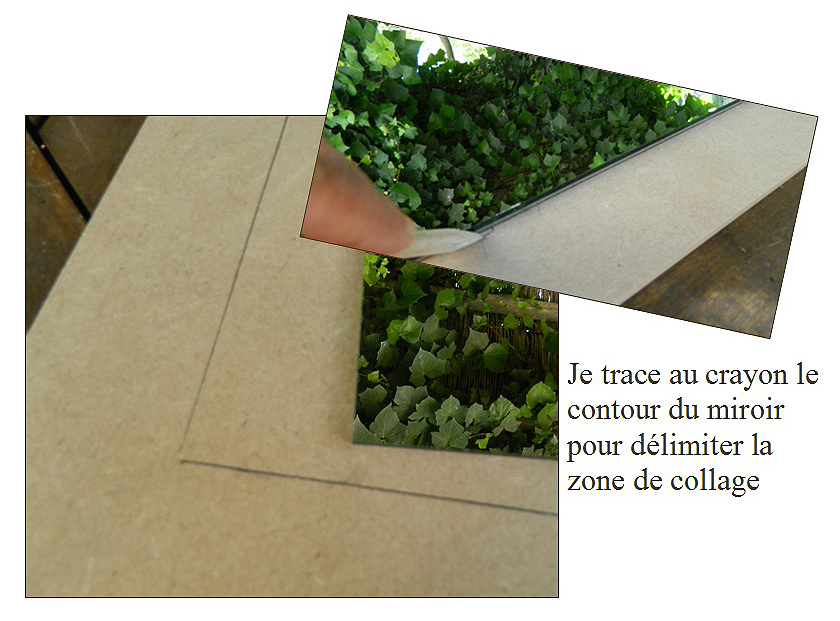 – Placer le miroir au centre du contre-plaqué et tracer au crayon le contour de votre miroir pour mieux délimiter votre surface à coller.