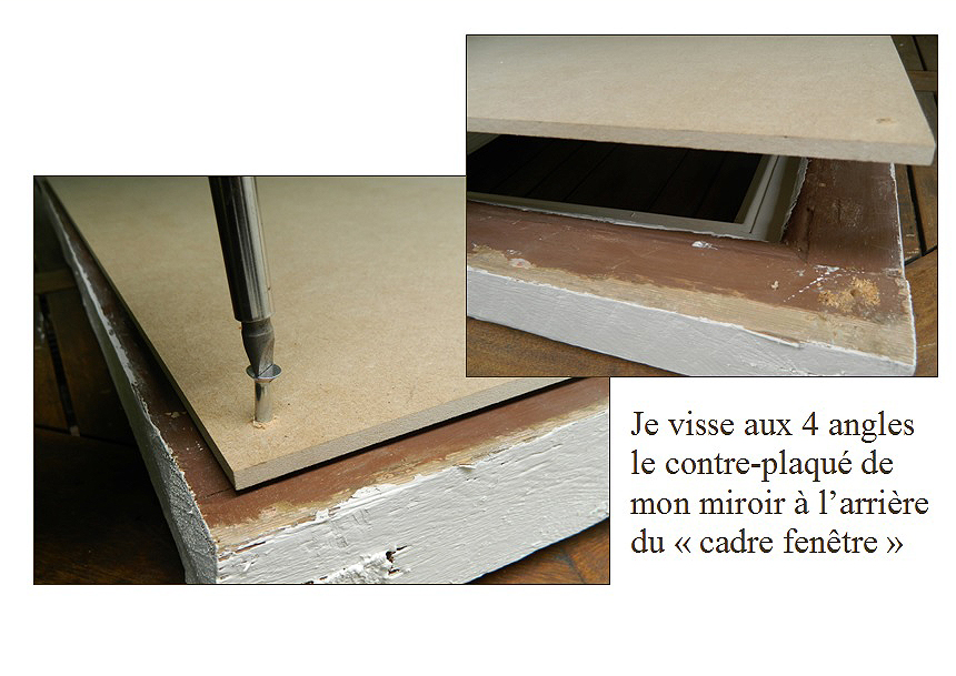 –  Je visse aux 4 angles le contre-plaqué et son miroir sur le cadre de la fenêtre