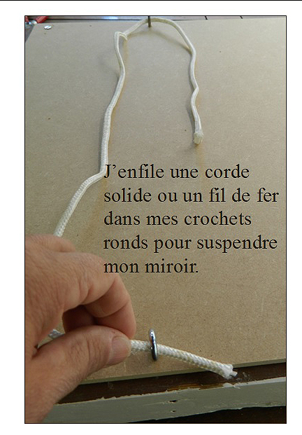 – Visser vos 2 crochets ronds à l’arrière et de chaque côté, vous pourrez enfiler une corde solide ou un fil de fer pour suspendre votre miroir!
