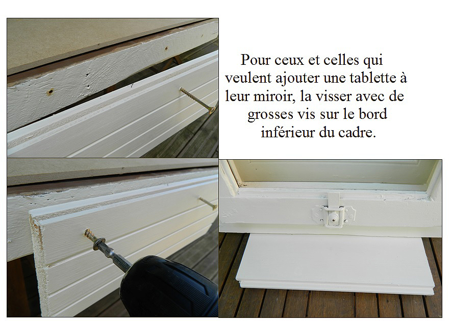 –  Puis pour ceux et celles qui veulent ajouter une tablette pour la déco pour y poser des pots de fleurs, visser aussi à 3 endroits la tablette avec des vis assez grande pour assurer sa solidité (voir photo ci dessous).