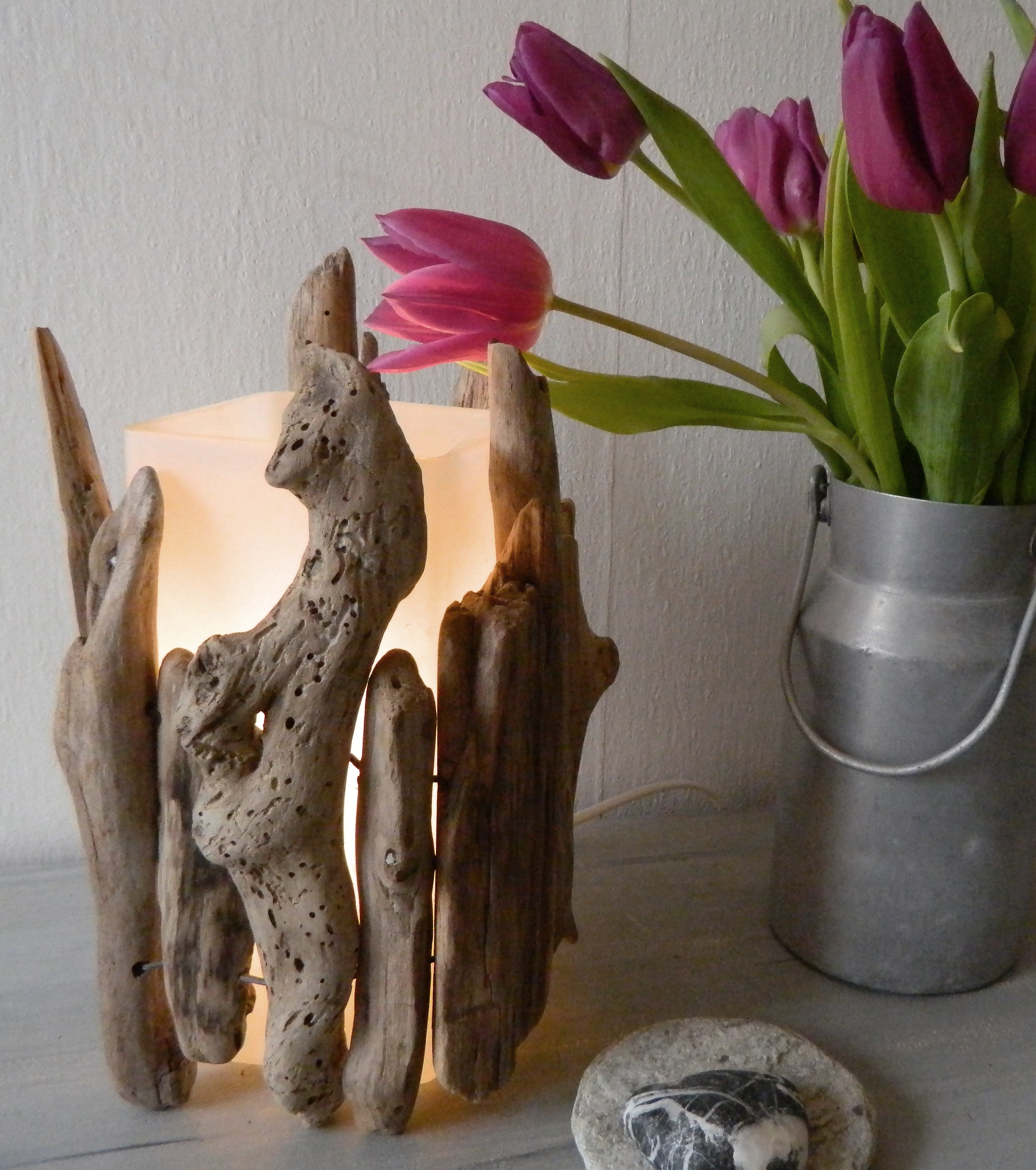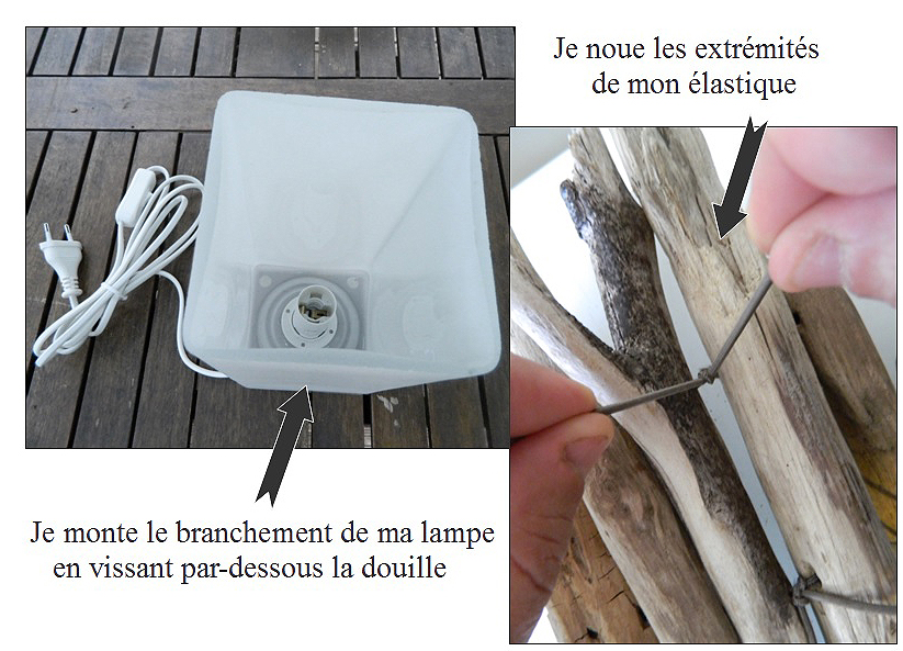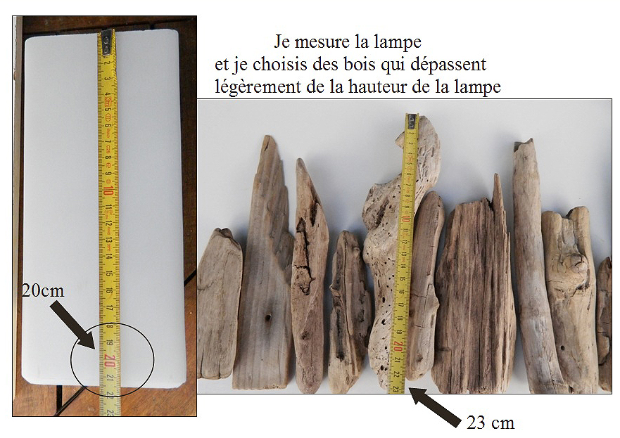 – Je choisis des bois flotté des toutes tailles, les plus haut dépassent un peu de la lampe (23 cm environ) .