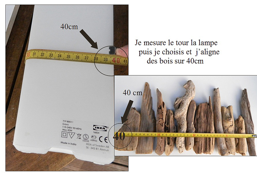 – Puis je mesure la circonférence de la lampe (40 cm) et je dispose côte à côte mes bois sur une longueur de 40 cm