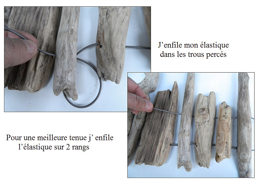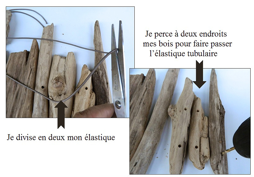– Pour une meilleure tenue de mes bois une fois en place autour de la lampe, je perce chacun de mes bois à 2 endroits identiques pour passer mon élastique.