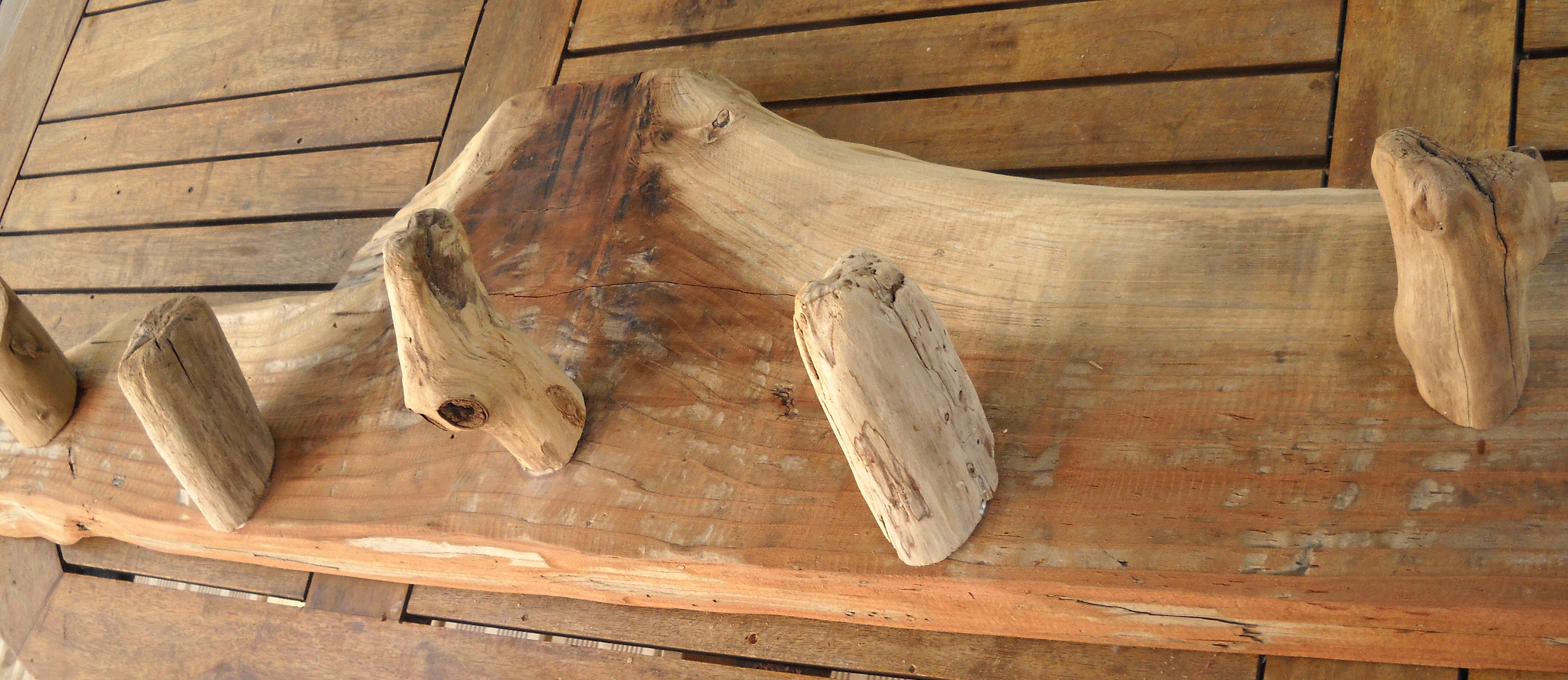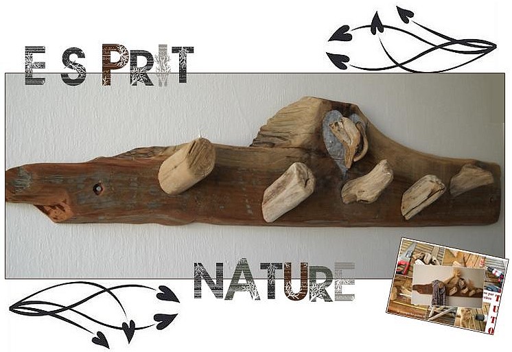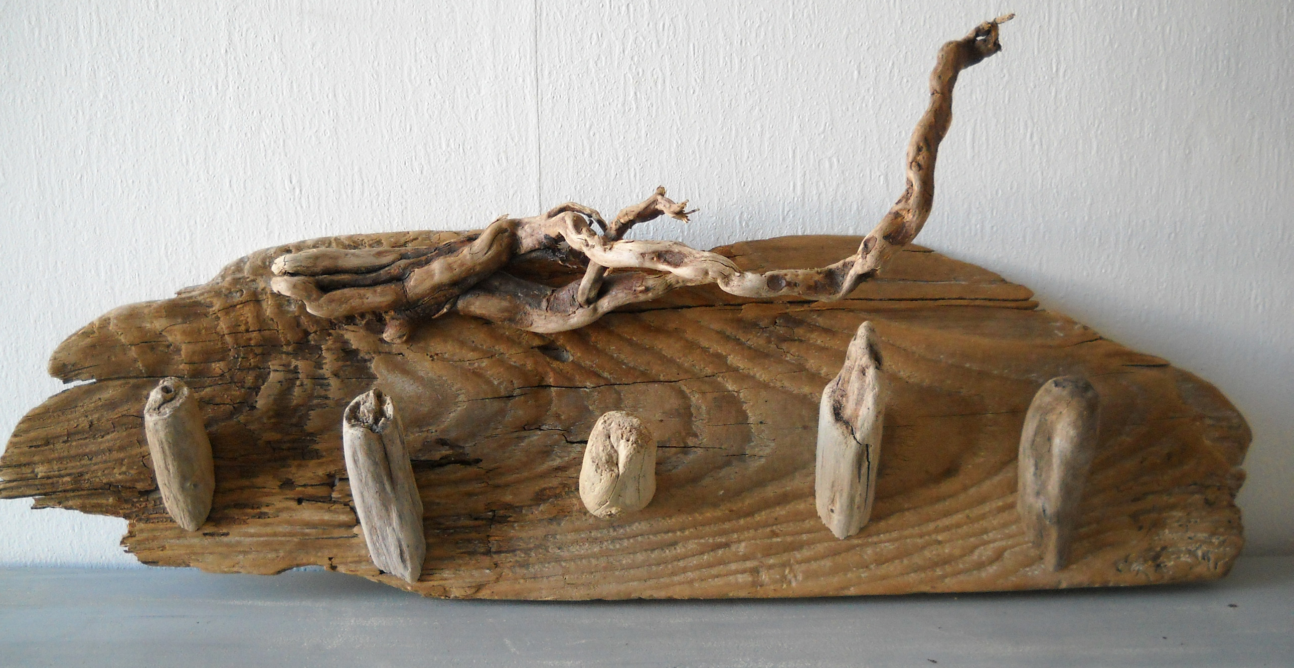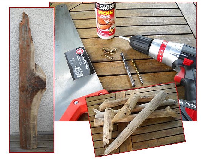– J’ai mis de côté 2 petits bois flotté pour camoufler les têtes de vis. Ils seront à coller sur la patère une fois qu’elle sera fixée au mur.