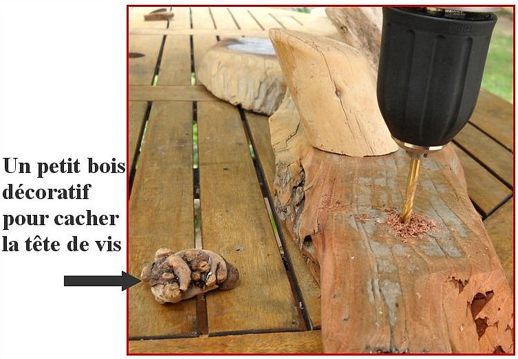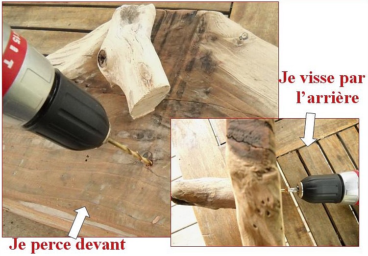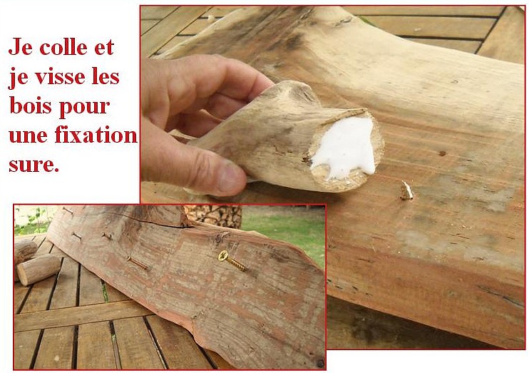 – Badigeonner un peu de colle à bois sur la surface à plaquer contre la planche, positionner votre bois sur la vis qui dépasse et visser par l’arrière.