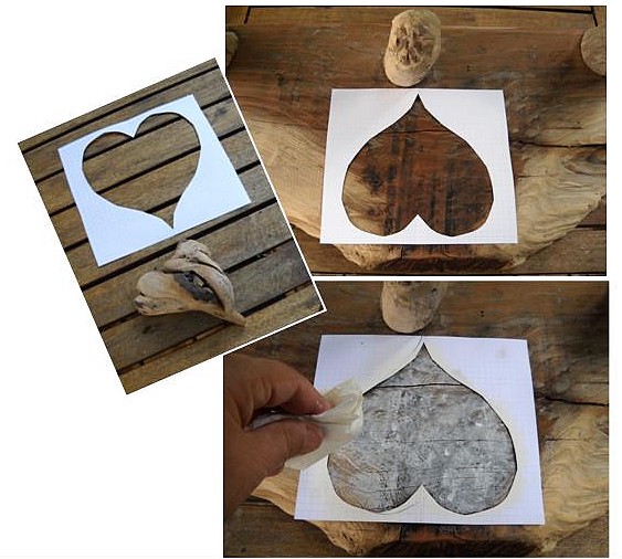 – Placer le cœur sur la planche et tamponner de peinture blanche avec une éponge l’intérieur de votre pochoir.
