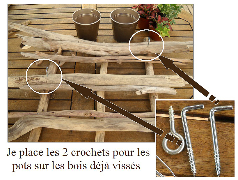 – Placer les crochets en les vissant sur les bois du quadrillage, ces bois sont vissés donc supporteront le poids des pots de plantes.