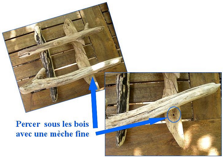 – Pour repérer l’endroit où vous allez placer votre vis par dessous, décalez légèrement les bois et percer à l’aide de la mèche fine.