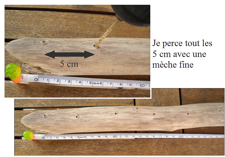 -Percer de part en part tous les 5 cm votre tringle à l’aide d’une mèche fine  (voir photo)