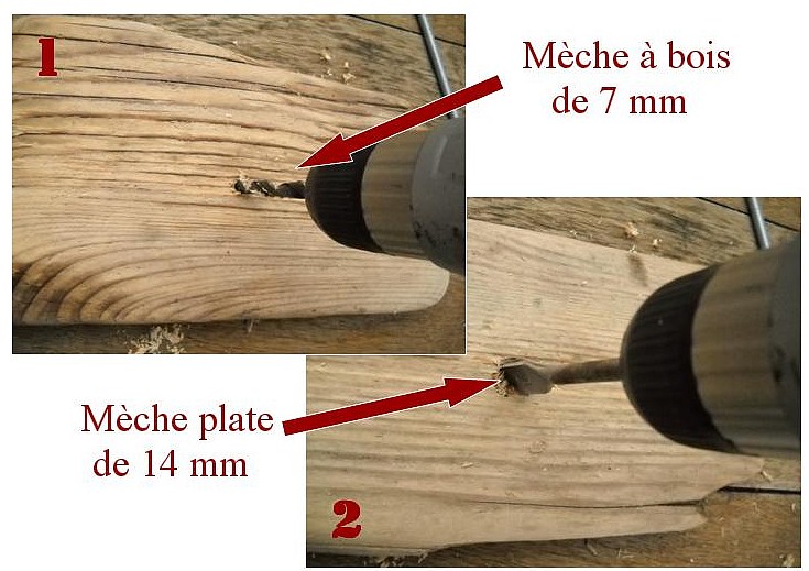 – Retourner la et de l’autre côté percer sur quelques millimètres de profondeur avec la mèche plate de 14 mm.