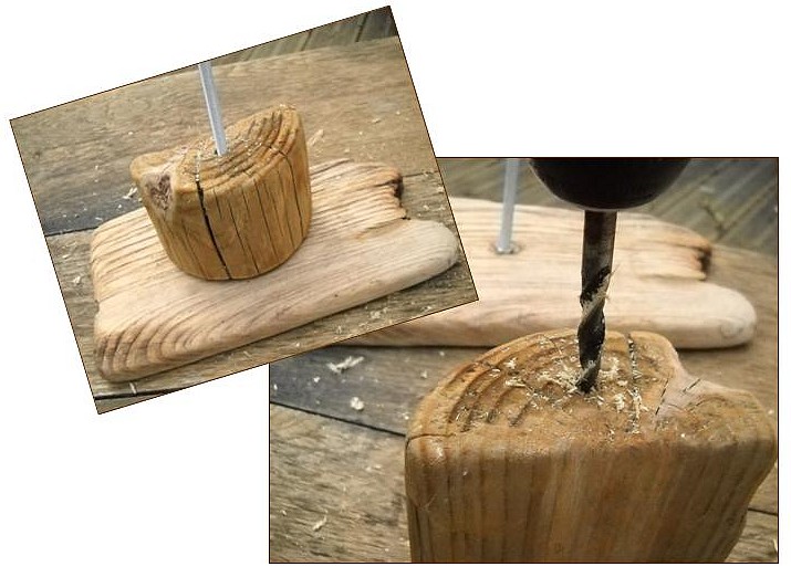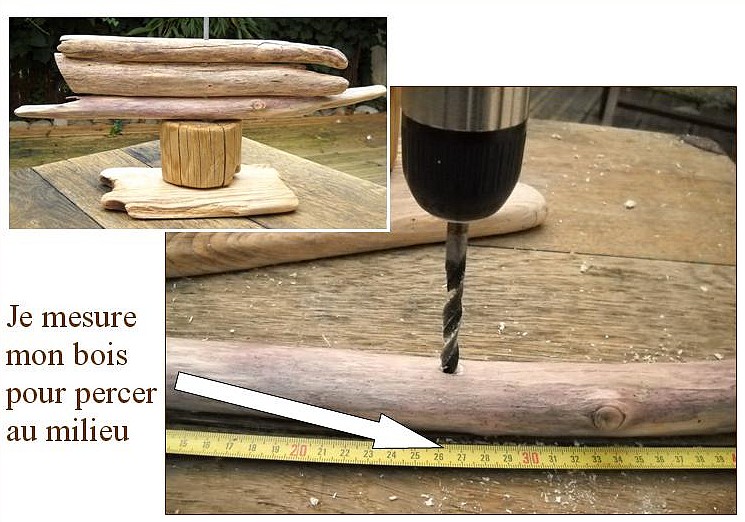 montage5– Pour fabriquer le socle avec sa tige, percer au centre de la planche avec votre mèche à bois de 7 mm.