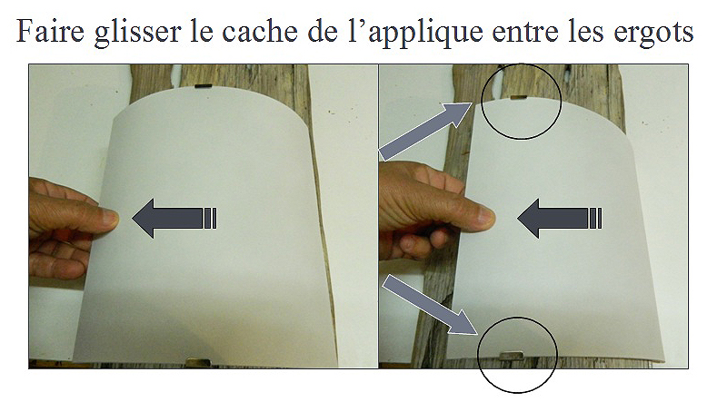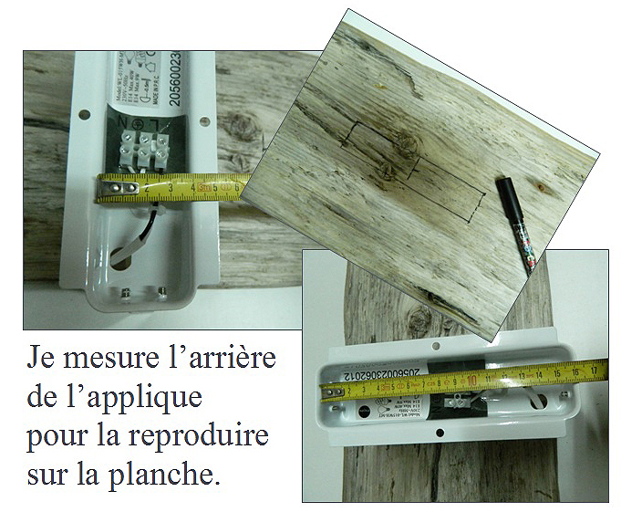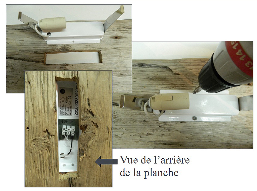 – En retournant la planche, vous devez avoir accès au domino , celui ci est fixé dans la cavité à un adhésif qu’il suffira de décoller quand vous connecterez les fils votre applique à votre branchement électrique mural.