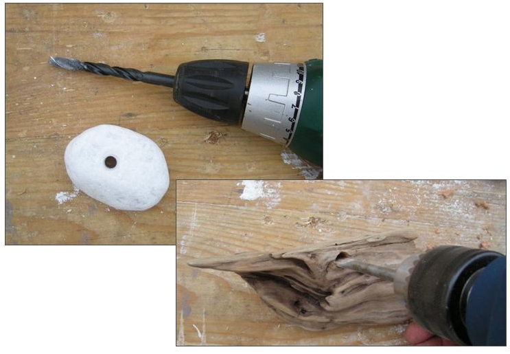 – Percer les galets de marbre de Carrare à l’aide de la mèche à béton de 12 mm et les bois flotté à l’aide de la mèche à bois de 12 mm.